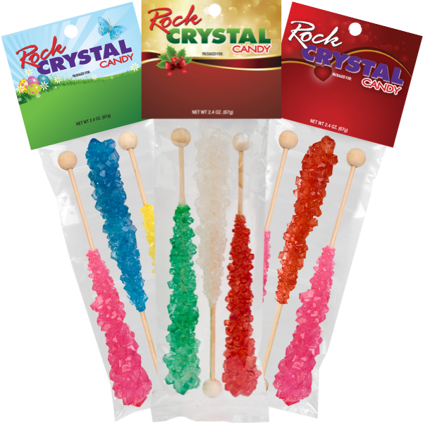 Free custom imprint or full color hangtag with $300 order of Rock Crystal Candy 3 Stick Peg Bags. One-time $50 plate fee on first order.
