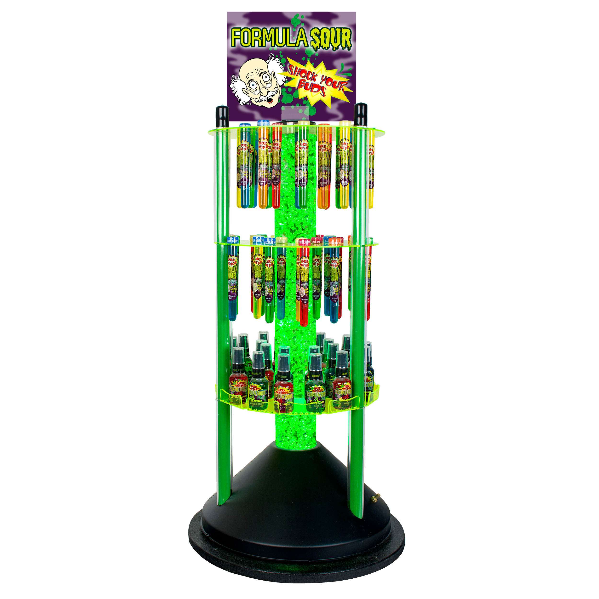 The Bubble Action Counter Display adds energy to your store and sells 5x more candy than traditional static displays. Formula Sour Liquid Candy has been creating sour faces for more than 20 years and now is available in traditional test tubes and an on-the-go spray bottle. The Bubble Action Combo Display includes test tube holders and shelves so that you can conveniently and easily offer both varieties for your customers.