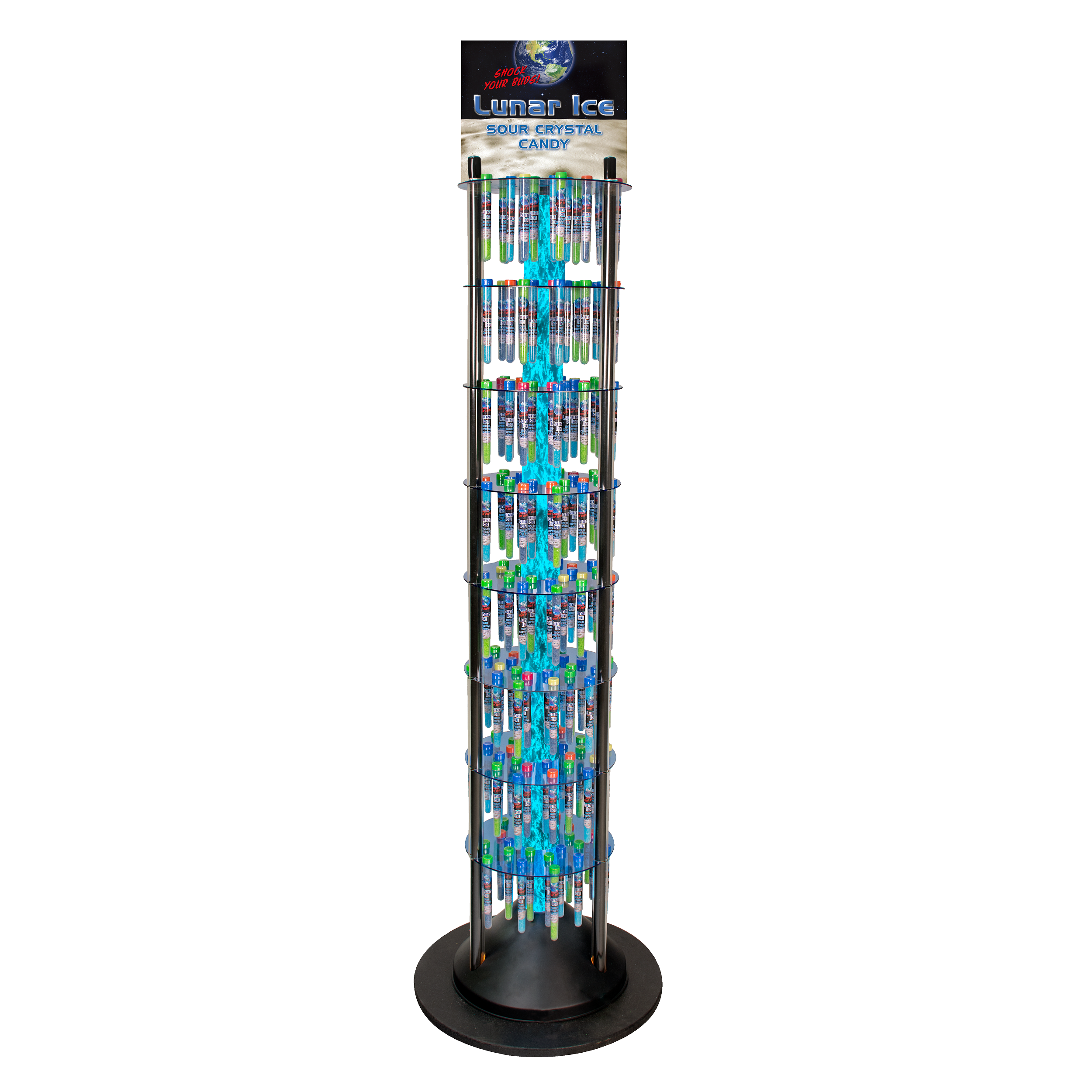 The Bubble Action Floor Display adds energy to your store and sells 5x more candy than traditional static displays. The Lunar Ice Shock Your Buds® Test Tube Candy is a sour Rock Crystal Candy that kids love and the Bubble Action Floor Display stands 6′ tall, features a blue LED bulb and holds 192 Test Tubes. Lunar Ice Test Tube candies command a 3x markup.