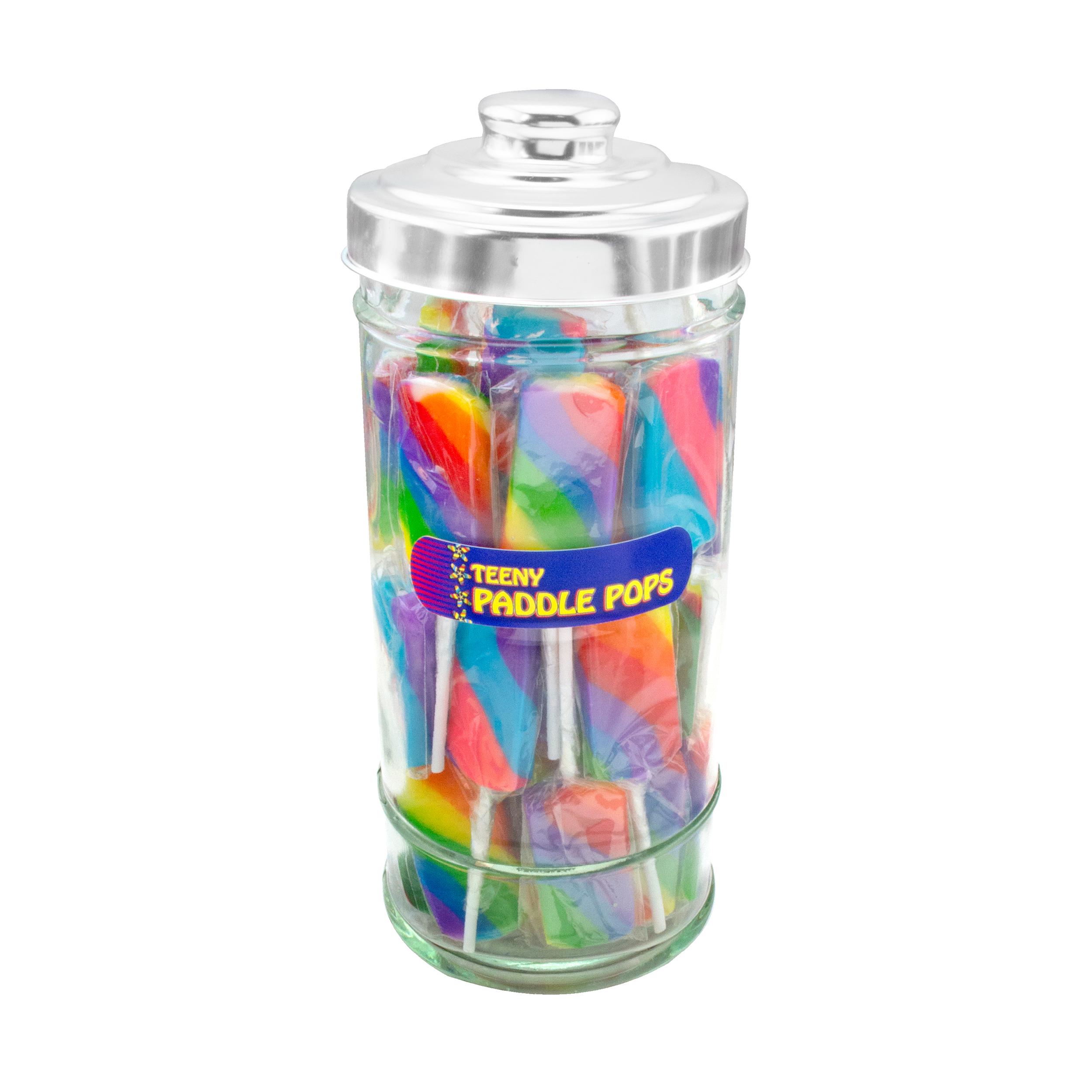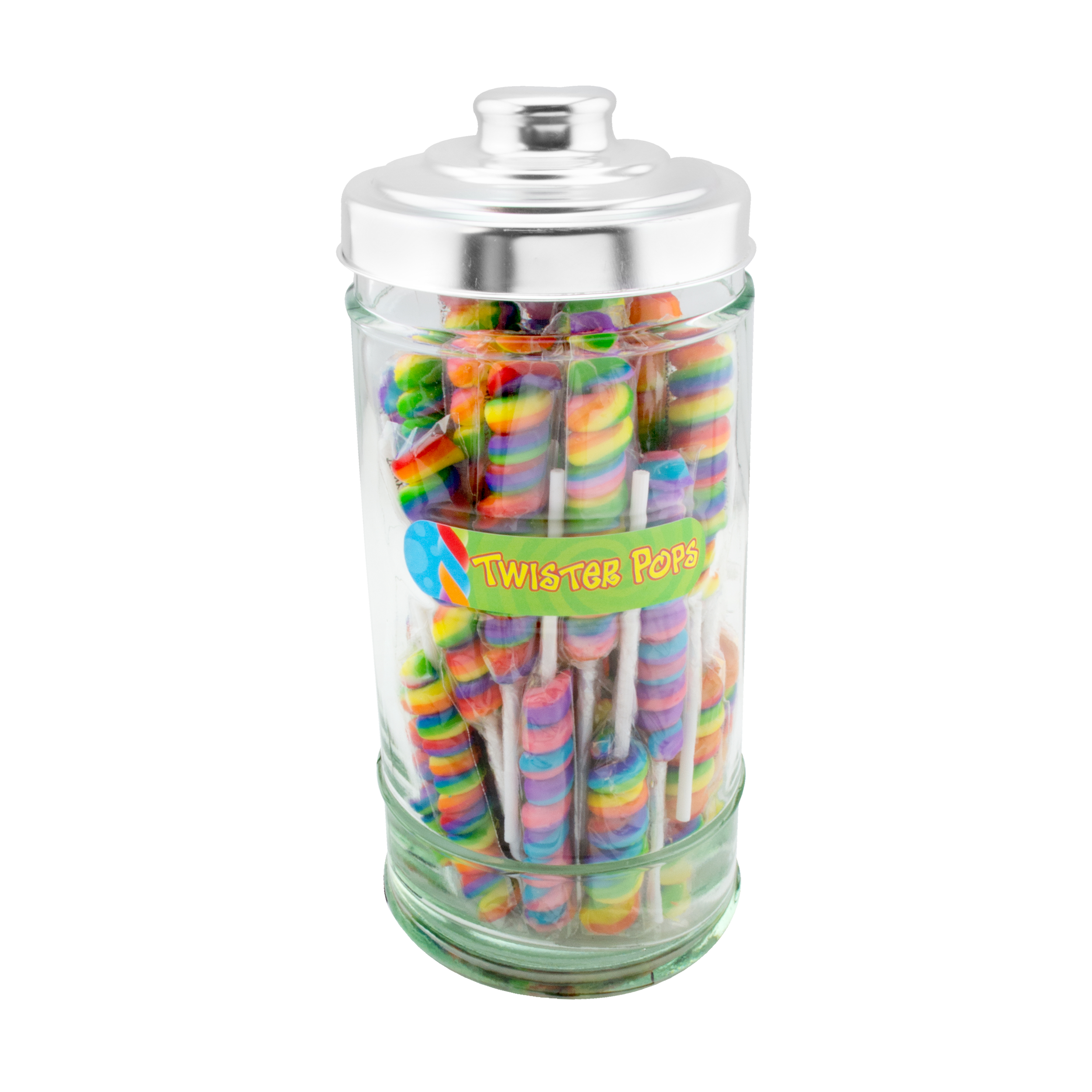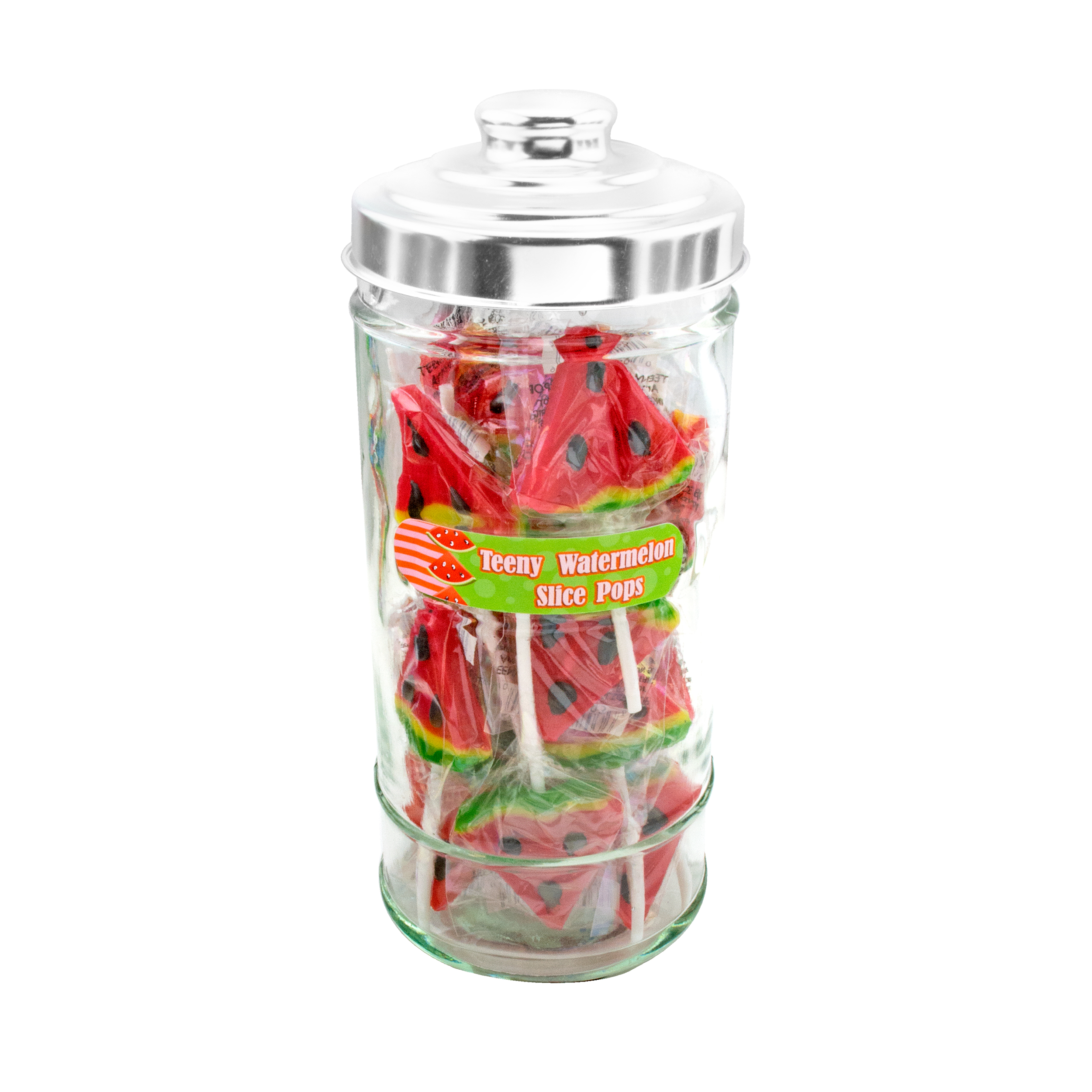 These beautiful glass jars add a touch of nostalgia to every store and create a colorful and organized display of Teeny Lollipops for customers to easily grab for impulse purchases. Includes label to match the candy you choose and metal lid.